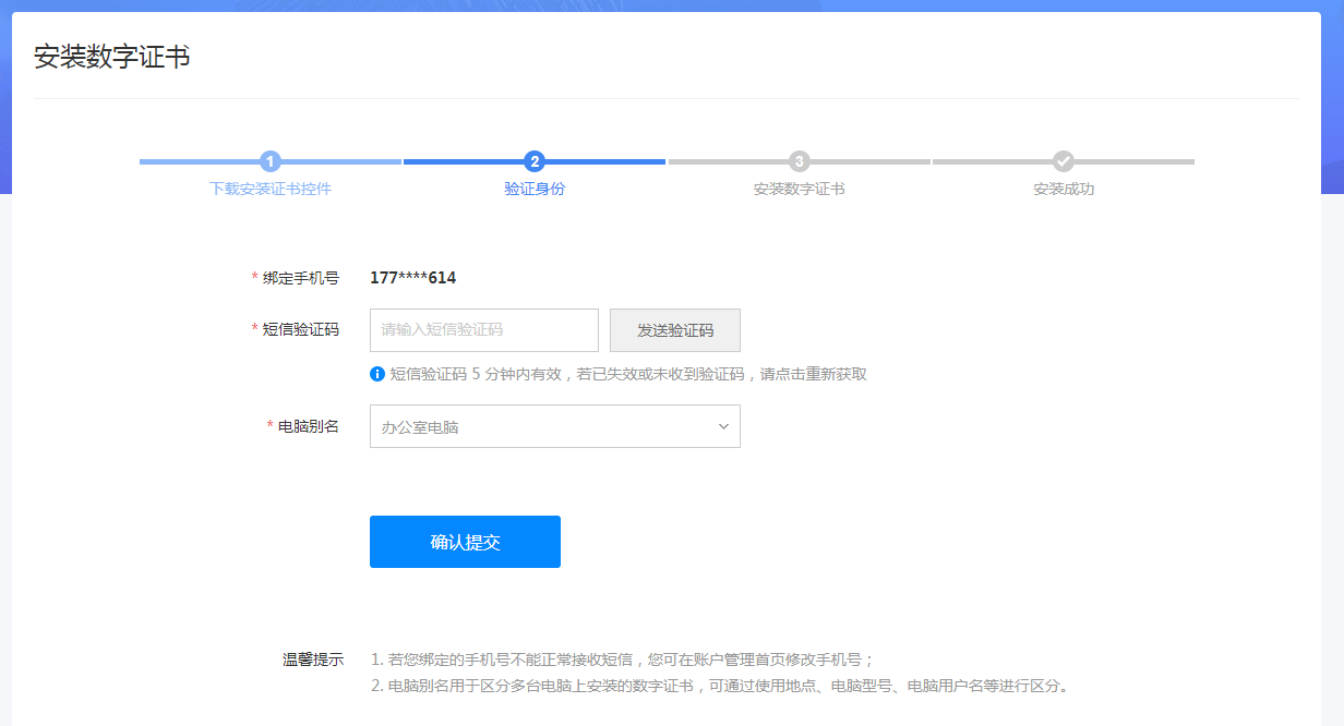 2)验证身份。这里需要商户绑定的安全手机完成手机验证,然后在电脑别称一项中输入证书适用的场合(比如办公室电脑、商铺电脑等等),最后点击【确认提交】。