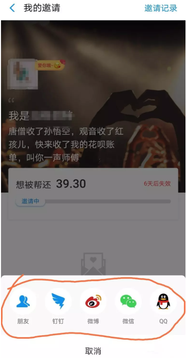 进入以下界面,如图,你可以邀请支付宝好友帮还花呗,还可以向钉钉、微博、微信、QQ好友发送邀请链接,