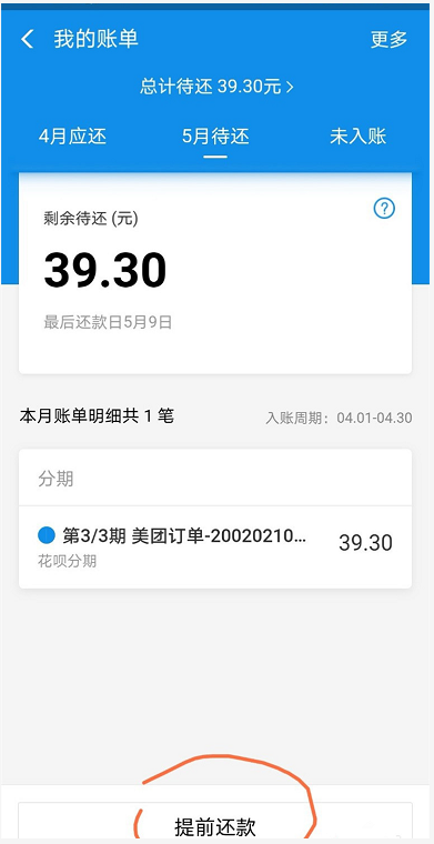 如图,5月待还金额是39.3元,由于没到还款日期,你可以点击选择【提前还款】,