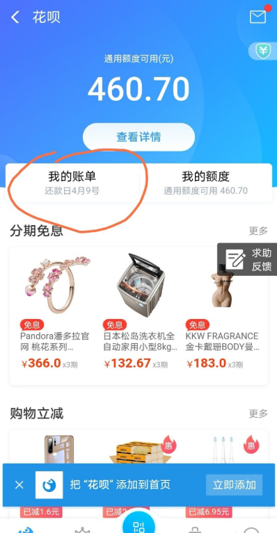 打开花呗服务功能,如图,点击【我的账单】,查看详情,