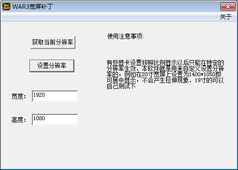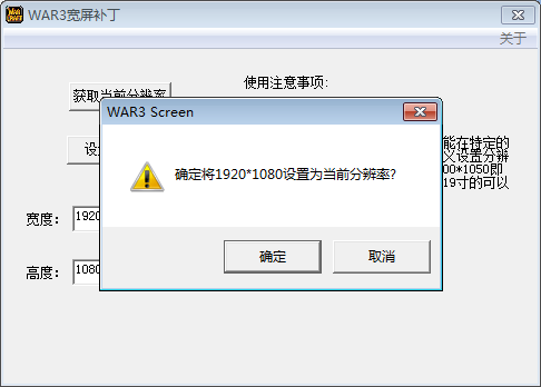 5、回到WAR3宽屏补丁界面,按照刚才查看的电脑分辨率数值,修改宽度和长度后的数值。比如如图将游戏图像分辨率修改为和电脑显示屏匹配的1920×1080,修改完成,点击【设置分辨率】。