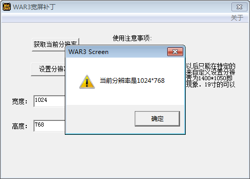 3、弹出WAR3宽屏补丁主界面,你可以点击【获取当前分辨率】,弹出新窗口(如图),显示WAR3当前的图像分辨率,可以看到当前分辨率为原游戏默认的1024×768。点击【确定】关闭窗口。