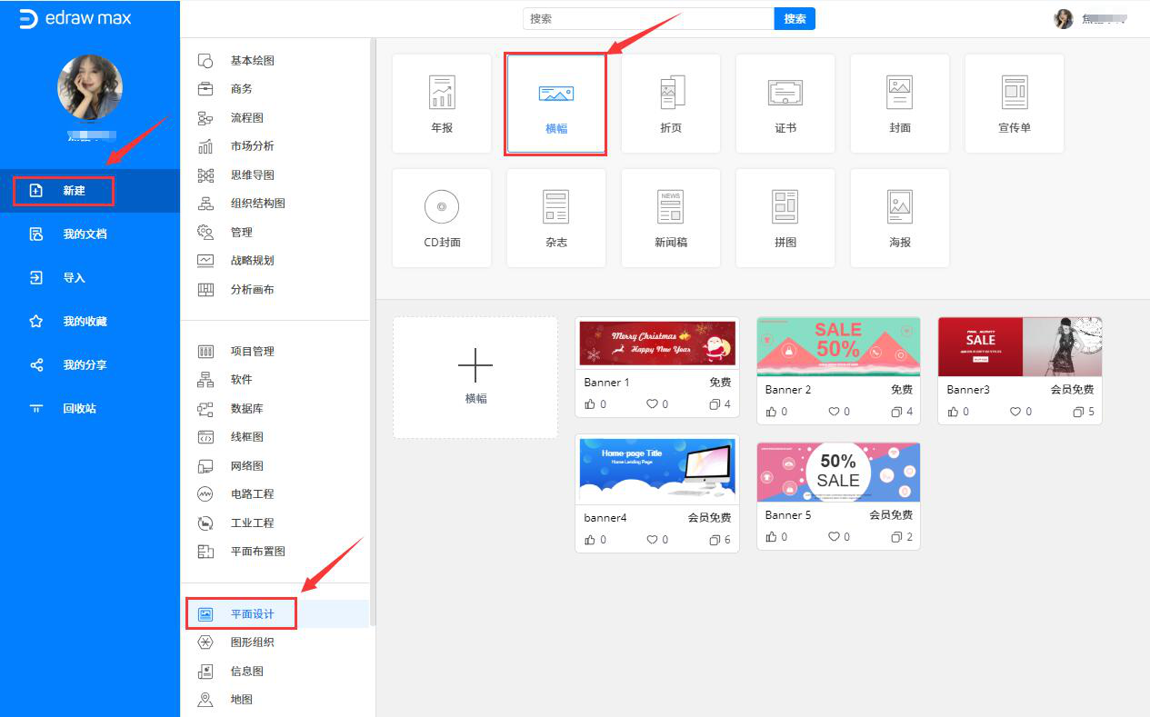 2、然后,进入亿图软件的操作界面。点击“新建”菜单中的“平面设计”,并在右侧的类型中点击选择“横幅”模板。