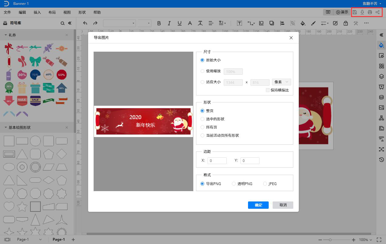 5、最后,亿图软件制作宣传横幅完成后,用户可以根据自己的需要点击软件右上方的“保存”、“下载”、“打印”、“分享”功能按钮,进行相关的操作。例如点击“保存”时,会弹出如下图的导出图片窗口,用户设置完成后,点击“确定”按钮即可。