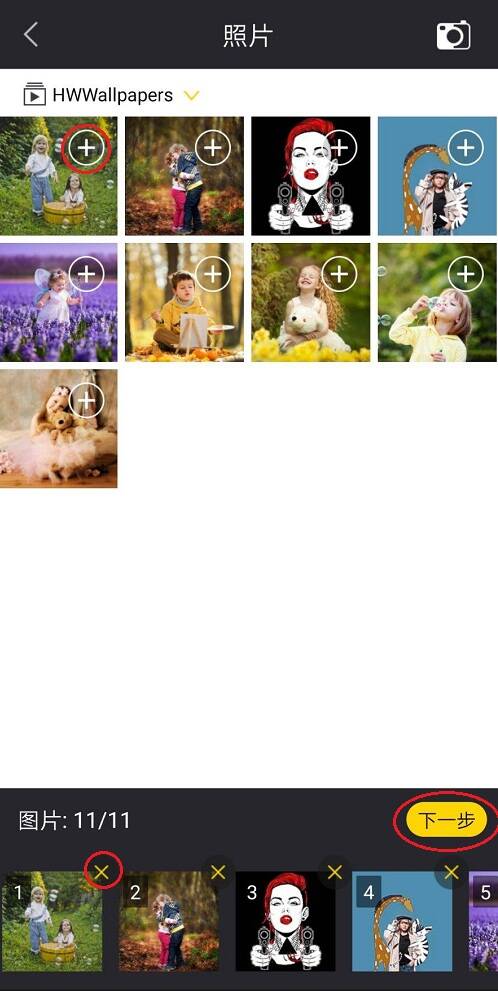 进入手机相册,点击【+】,添加图片,图片添加完成,点击【下一步】,进入视频模板,