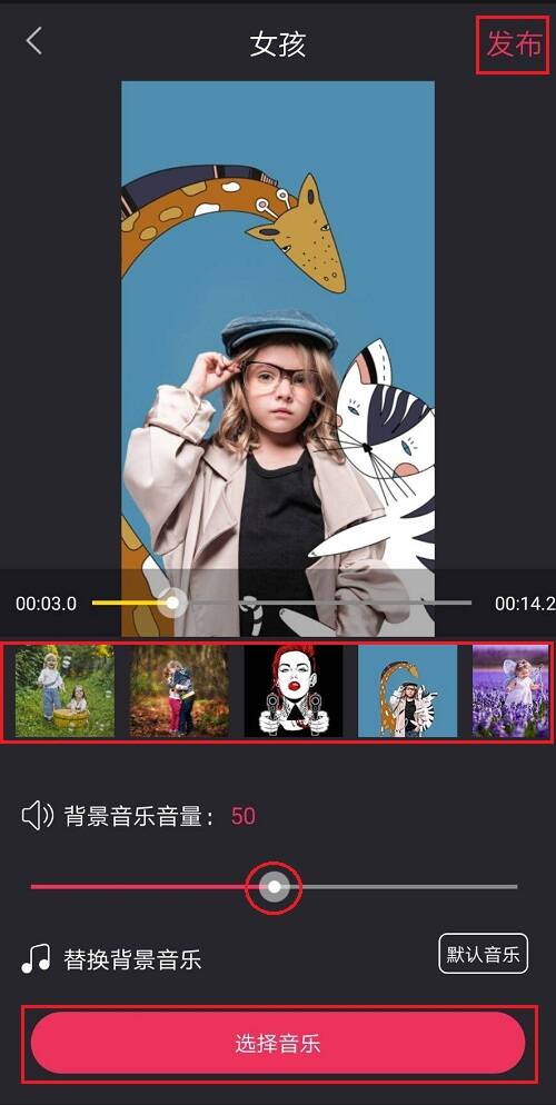 如图,点击图片可以替换图片素材,移动白色标点可以调节背景音乐音量,点击【选择音乐】,更换背景音乐;设置完成,点击右上角的【发布】,即可将照片视频保存到手机相册。