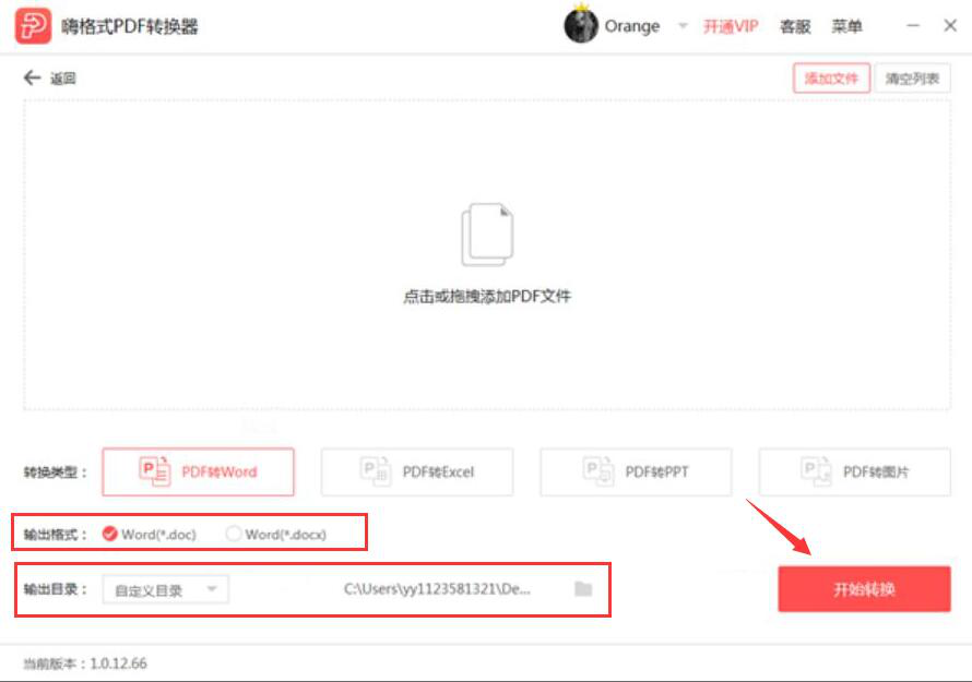 4、最后,输出格式勾选“Word(*.doc)”,并自行设置输出目录,再点击“开始转换”的红色按钮,嗨格式PDF转换器即可将PDF转换成Word。