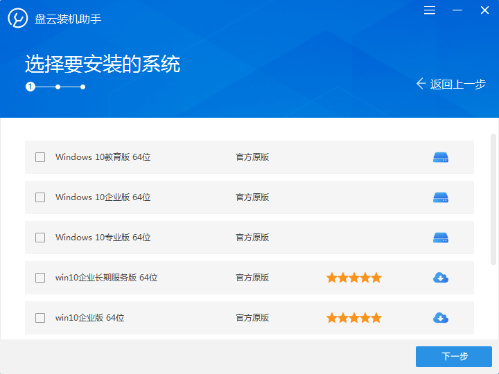 2、安装完成,打开盘云装机助手,选择要安装的操作系统类别,然后勾选需要的版本,点击【下一步】。