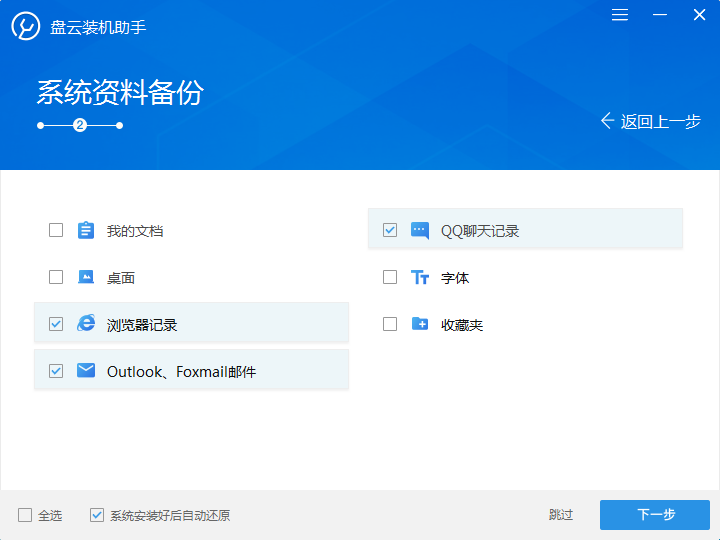 3、进入“系统资料备份”界面,用户可以勾选或全选用户资料比如浏览器记录、QQ聊天记录进行备份并勾选左下角“系统安装好后自动还原”进行备份还原设置,之后点击【下一步】,当然也可以选择【跳过】。