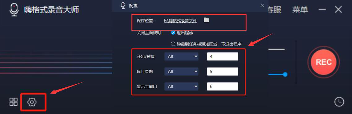 7、最后,点击嗨格式录音大师界面左下方的齿轮图标进入设置页面,在该页面中,用户可以根据自己实际选择录音文件的保存路径和相关的录音快捷键。利用快捷键进行录音,会发现更高效。