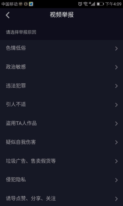 进入抖音举报视频入口,根据提示选择要举报视频的原因,