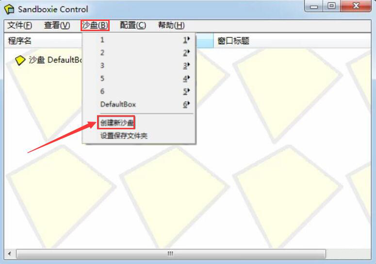2、然后,点击Sandboxie菜单栏的“沙盘”,并在其菜单中点击“创建新沙盘”,并将该新沙盘命名为1。