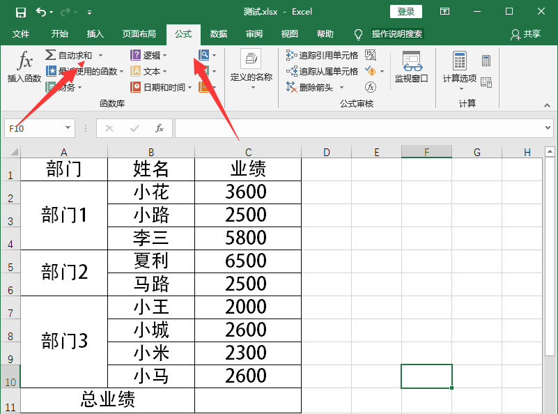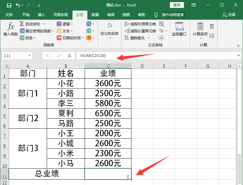 打开一个Excel表格文件,如图,需要计算总业绩,如果你直接使用SUM函数进行求和运算,得出结果是0,说明公式错误,