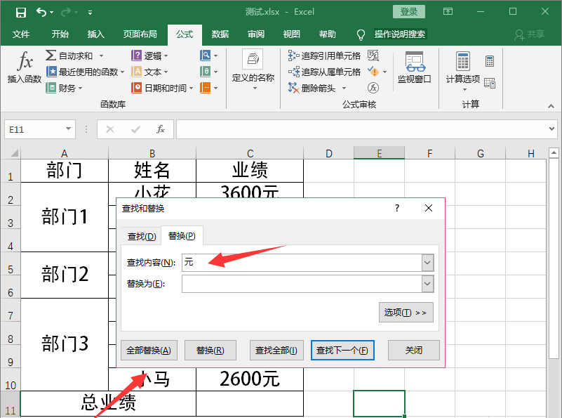 首先点按快捷键【Ctrl+F】,弹出【查找和替换】对话框,点击替换,【查找内容】设置为元,点击【全部替换】,