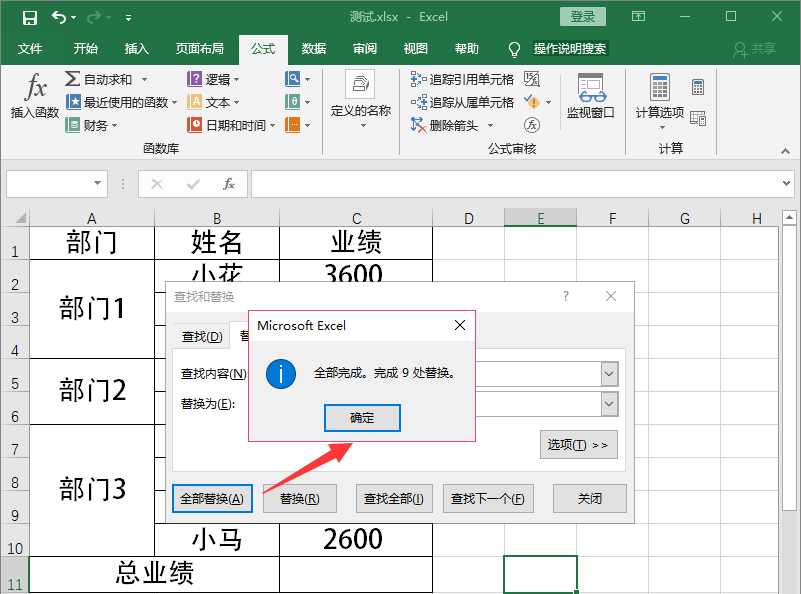 此时会弹出提示框,显示替换完成,点击确定,再次回到【查找和替换】对话框,关闭面板,