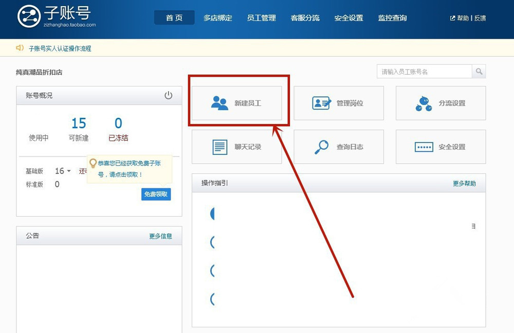 进入子账号后台管理窗口,如图,点击【新建员工】,开始设置,