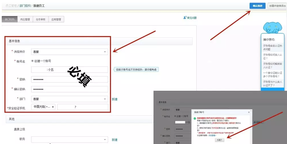 输入基本信息,选择岗位、账户名、密码、部门、手机号,其他信息无需填写,点击【确认新建】,