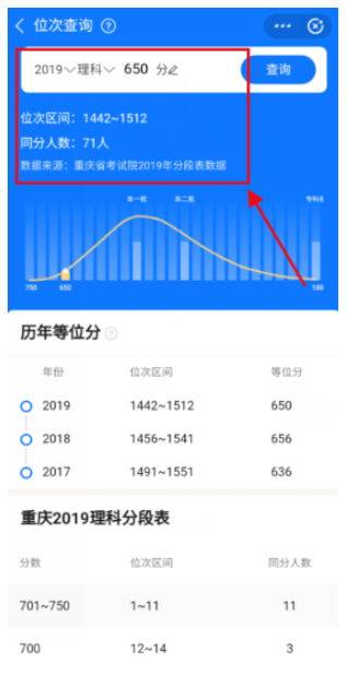 可以看到当前分数在当地的排名情况和其他分数各阶段的排名。