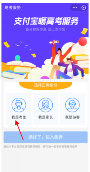 如图,打开高考服务小程序,选择【我是考生】,以这个身份进入小程序,