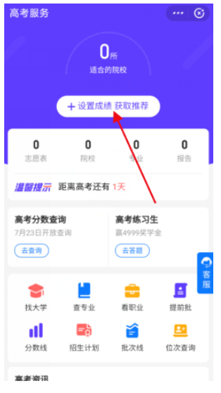 然后点击上方的【设置成绩,获取推荐】,完善高考信息,按照提示进行操作,点击确定,