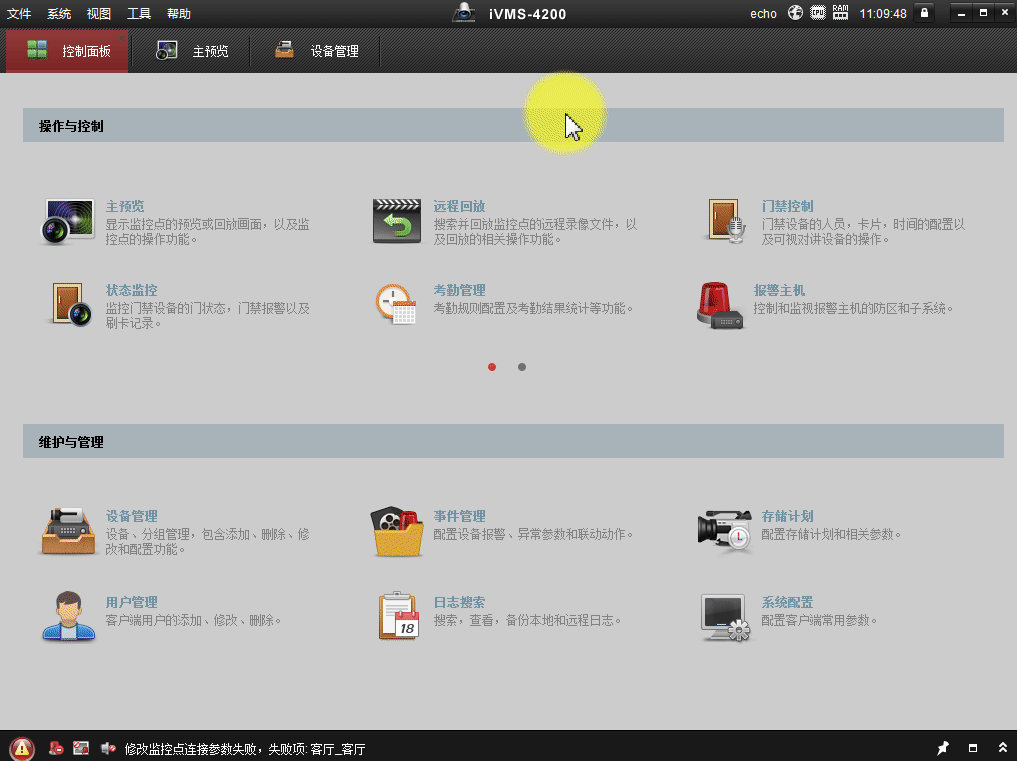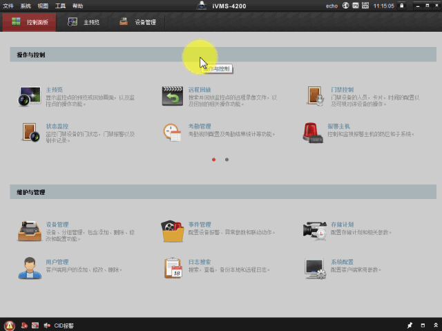 打开海康4200电脑客户端,进入主界面,在上方点击【控制面板】——【设备管理】——【海康设备】,添加录像机或者摄像机,确认设备网络状态正常,然后在【主预览】界面选择监控点预览。
