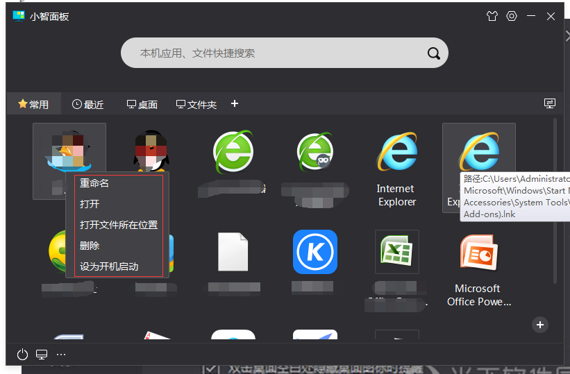 6、下图名为“小智面板”的窗口即为软件主界面,将鼠标放置在任意快捷方式上,就会自动显示它的路径;右击任意图标,可以在右键下拉栏中对软件进行重命名、设为快捷启动、打开文件所在位置等操作。