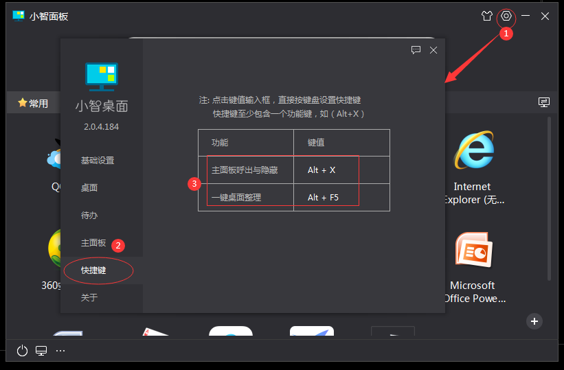 8、想要快速整理桌面,最快的方式是使用快捷键。点击右上方齿轮图标,弹出设置窗口,点击窗口左侧【快捷键】们可以在窗口右侧查询到“一键桌面整理”的快捷键“ALT+F5”。
