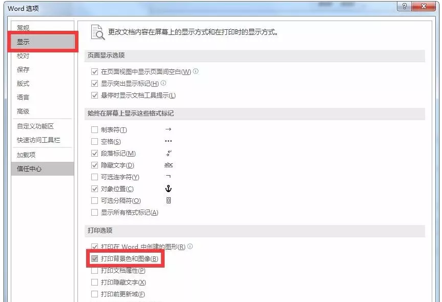 打开Word选项窗口,如图,点击【显示】——【打印背景色和图像】,进行勾选,点击确定,