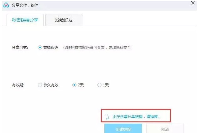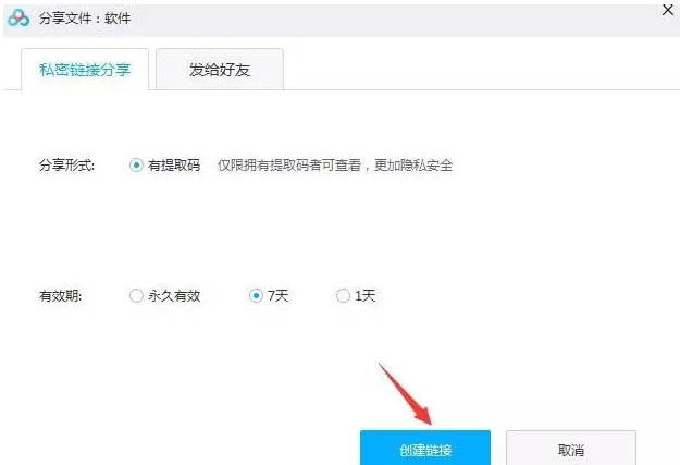 如图,点击【私密链接分享】标签,按要求对文件进行创建,默认分享形式,选择一个有效期,然后点击【创建链接】,