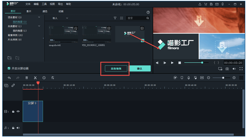 点击【高级编辑】,进入高级分屏编辑窗口,在预览框下方编辑轨道,用于调节视频的出入点,
