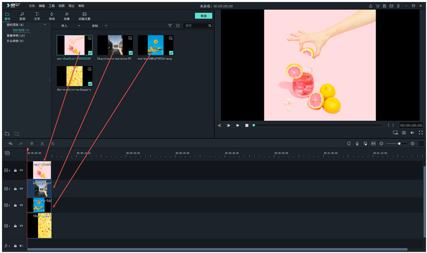 如图,将视频导入不同的轨道,每加入一个新的视频,就会自动生成一个新的轨道,