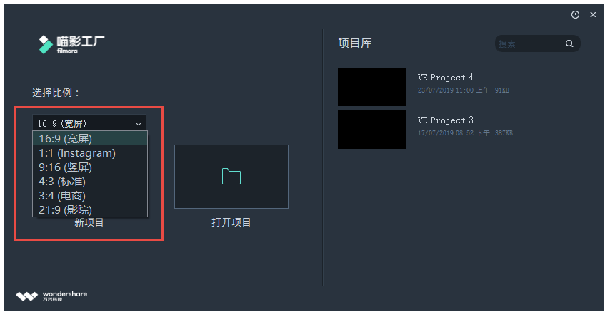 首先打开喵影工厂,进入主界面,选择项目比例,这里提供了多种模式,大家根据实际情况进行选取,