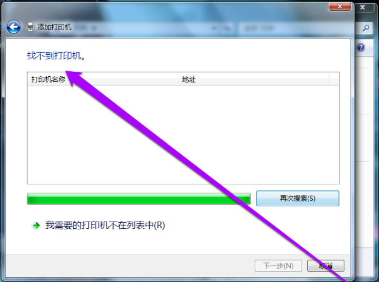 系统搜索结束,没有找到打印机,出现这种现象是由几种原因造成的,一是没有局域网共享打印机,一是打印机没有开机,经过检查,如果发现这两种原因都不存在,即说明打印机的网络地址和Windows7系统地址不在一个网段,