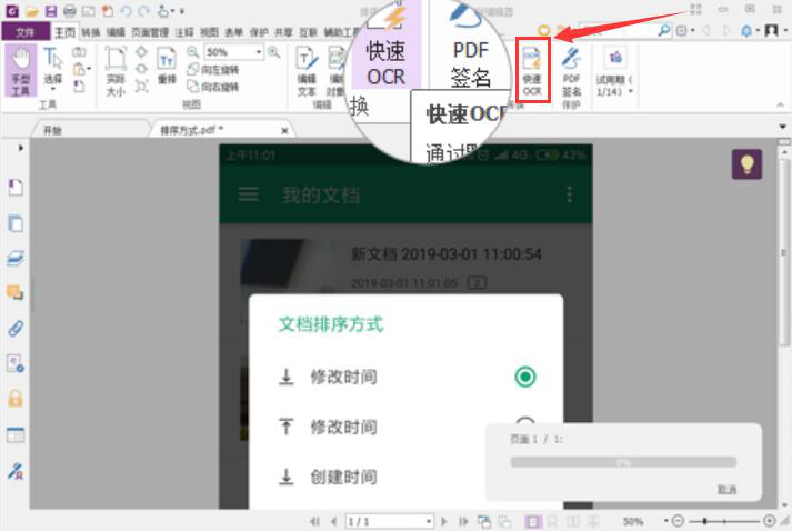 2、然后点击福昕高级PDF编辑器界面顶部工具栏中的“快速OCR”,如下图所示。