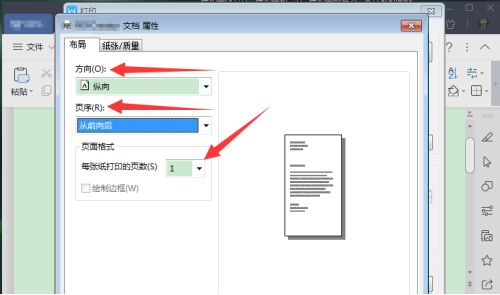 5、弹出文档属性窗口,设置打印布局、页序、页面格式等信息。