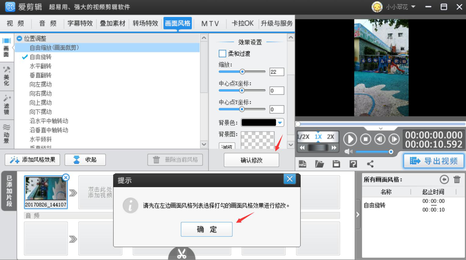 5、缩放设置完成,预览视频,确认无误后,点击“确认修改”按钮,并在弹出的提示窗口中点击“确定”。