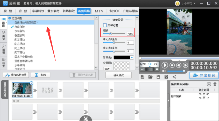 6、最后,点击爱剪辑左侧中部的“添加风格效果”便可以应用自己对视频进行的旋转和画面裁剪操作。再点击右侧中部的“导出视频”按钮将视频导出到自己想要的路径即可。