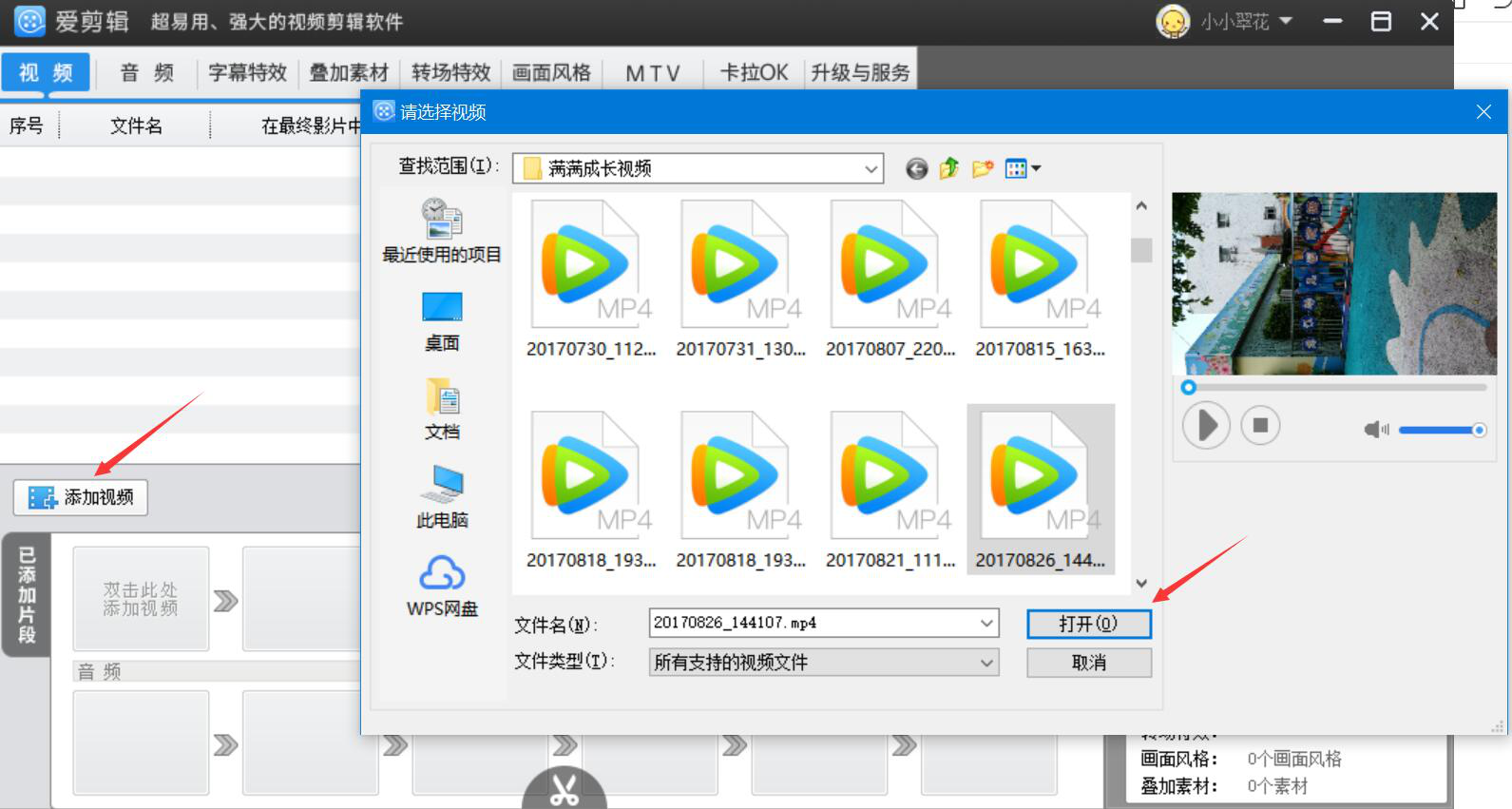 2、然后,在爱剪辑的界面左侧中部,点击“添加视频”按钮,并在弹出来的窗口中找到需要旋转的视频,点击“打开”按钮将它导入。