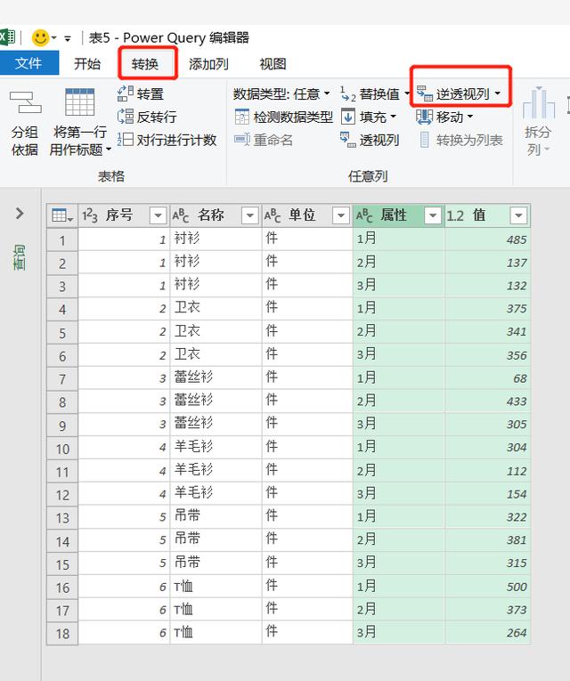 3、点击【转换】选项卡中的【逆透视列】,表格转换成了一维,如图,
