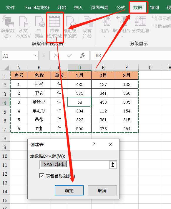 1、选中表格,在菜单栏点击【数据】——【获取和转换数据】——【自表格/区域】命令,弹出创建表窗口,点击【确定】,