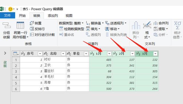 2、打开Power Query编辑器,先点击选中【1月】列,再按住Ctrl键,点击【2月】、【3月】,同时选中这三列,