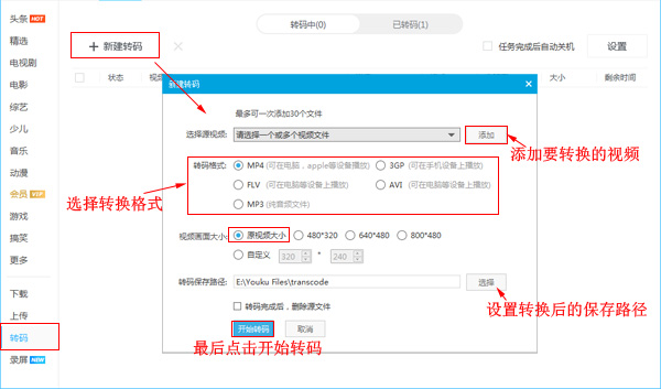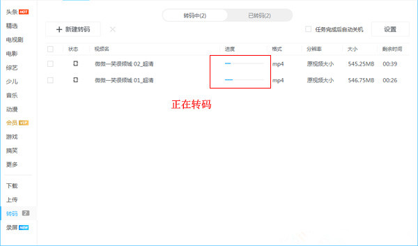 视频下载完成,在软件左侧的菜单栏找到【转码】功能,点击【新建转码】,进入窗口,添加刚刚下载的kux格式视频,设置转码格式,软件默认选择MP4格式,【视频画面大小】默认不更改,设置转码保存路径,最后点击【开始转码】,