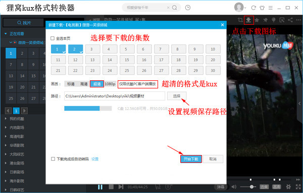 下载安装狸窝kux格式转换器,打开软件,如图,随意点击一个视频,进入播放界面,鼠标点击下载按钮,出现弹窗口,进行相关设置,画质选择超清,这里显示“仅限优酷PS客户端播放”,然后点击【开始下载】,