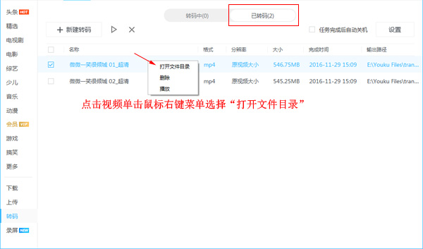 视频转码成功,点击【已转码】,选中视频,鼠标右击,选择【打开文件目录】,找到视频文件,