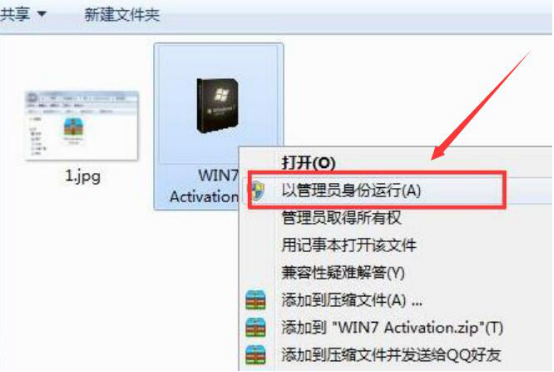 1.首先,用户可以在本站下载win7激活软件activation。下载后将其解压,右键单击“WIN7Activation.exe”应用程序,在右键菜单中点击“以管理员身份运行”。