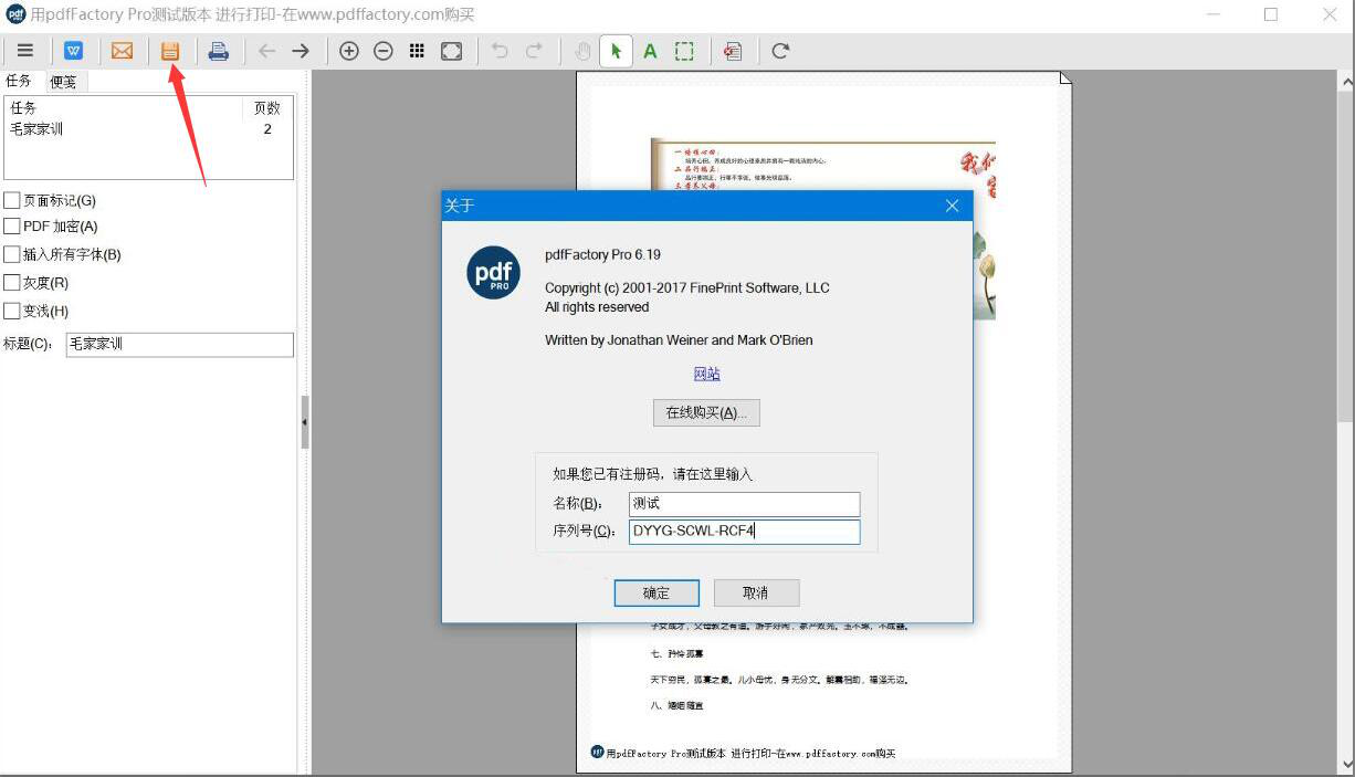 5、最后,点击PDFFactory界面上方的保存按钮,即可将Word打印结果保存为PDF文件。