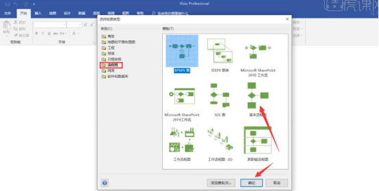 3.然后,visio会自动弹出“选择绘图类型”的窗口。在此窗口中点击“流程图”,从它的众多模板中选择适合自己用的模板。例如本文中选择的是“基本流程图”模板,点击“确定”按钮。