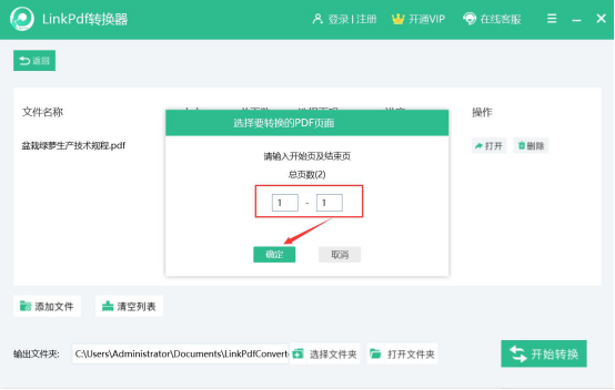 4.此时,linkpdf转换器便会弹出如下图的窗口。在此窗口中,用户输入自己想要提取的页面开始页和结束页,再点击“确定”按钮。