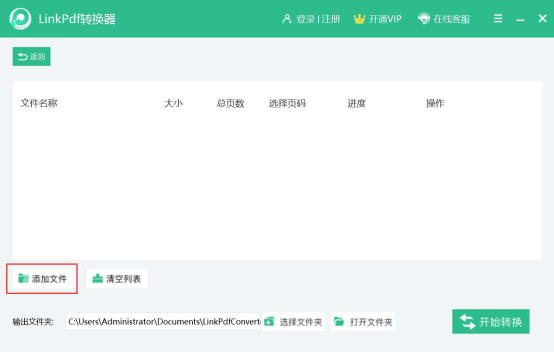 2.然后,在linkpdf转换器的操作界面中,点击“添加文件”按钮将需要提取页面的PDF文件导入。