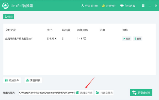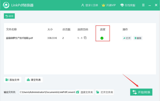 6.最后,点击“开始转换”按钮,linkpdf转换器便开始执行页面提取的指令。提取完成时,在PDF文档一栏中可看到进度显示是绿色的打勾符号。